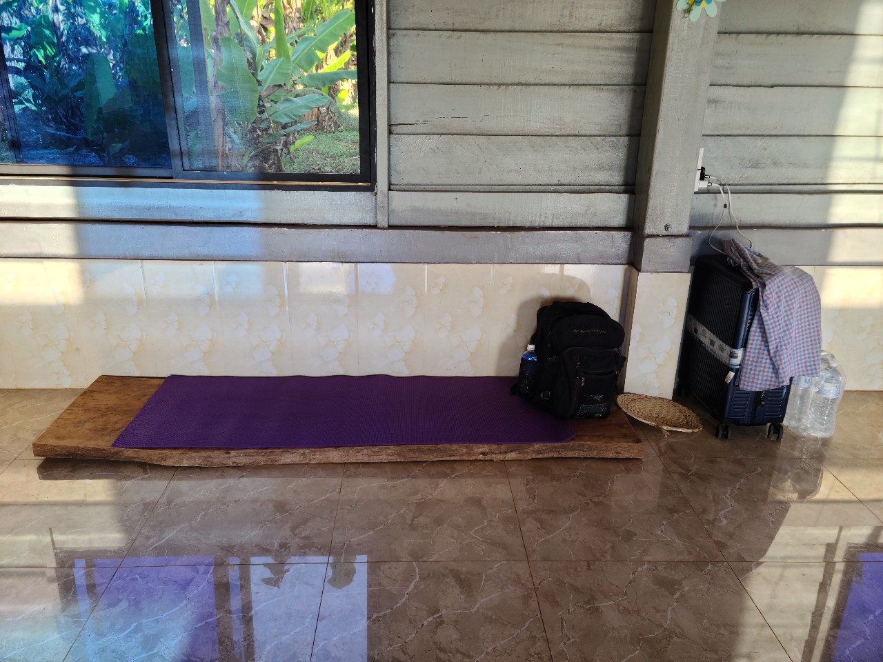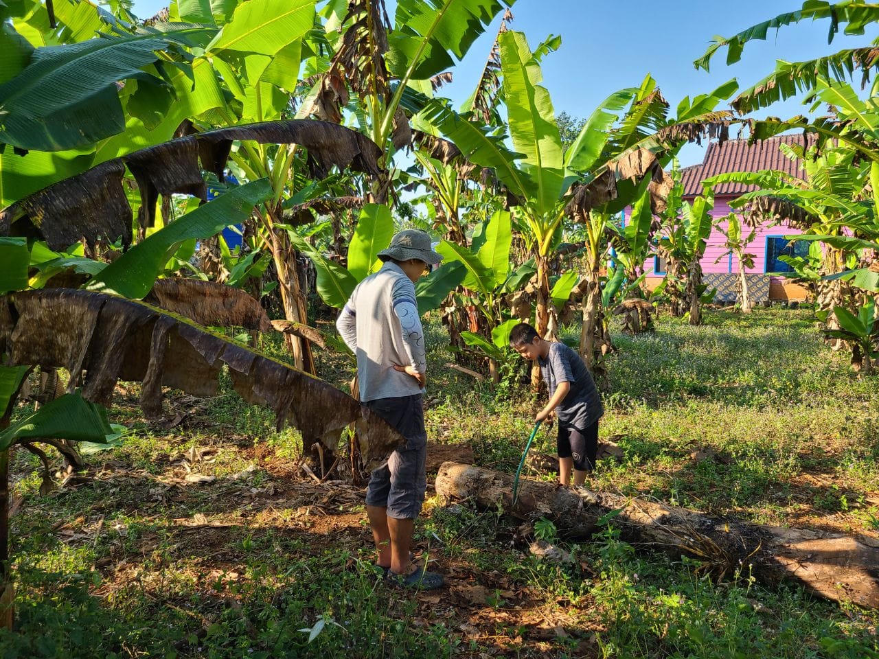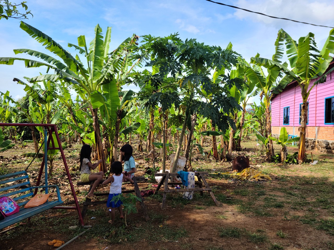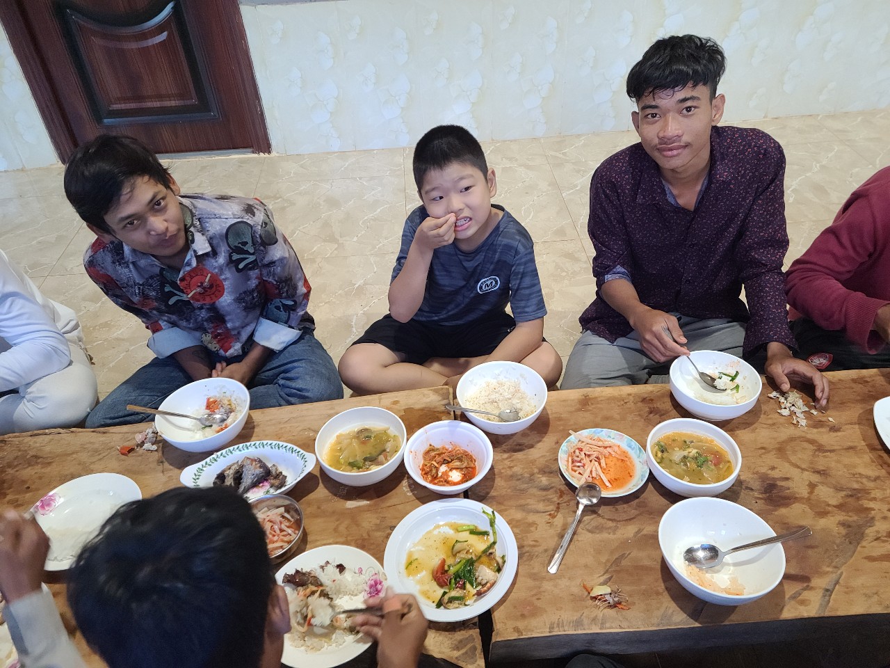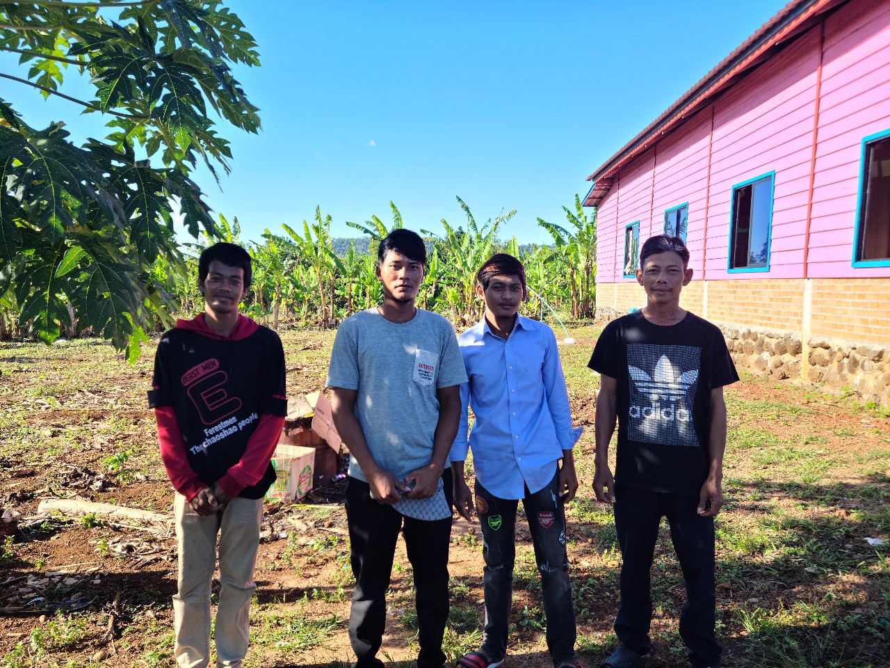 소넴사역자가 벌써 건축예정지의 바나나 나무를 옮겨놨읍니다 KBS 목수 4명 이들의 실력을 기대합니다. 이곳에 도착하자마자 소넴 사모의 순산 소식이 들려왔읍니다. 식탁을 임시 침대로 사용하고 KBS 아줌마가 장에가서 찬거리를 사오고 돼지고기가 많이 비싸다고하고 가져온 정수기를 설치해 이 물을 마실 예정입니다. 요새는 날씨가 안춥다고 하네요. 소넴 남동생만 교회를 지키고있읍니다. 버스를 타고온 4명은 오다가 버스 고장으로 2 시간 기다렸다합니다. 이들은 스라에엄벌에서 부터는 솜판 사역자 차로 왔읍니다. 똥안 선생 가족은 우리를 내려주고 가족 여행을 떠났읍니다. 내일부터 일을 시작합니다.