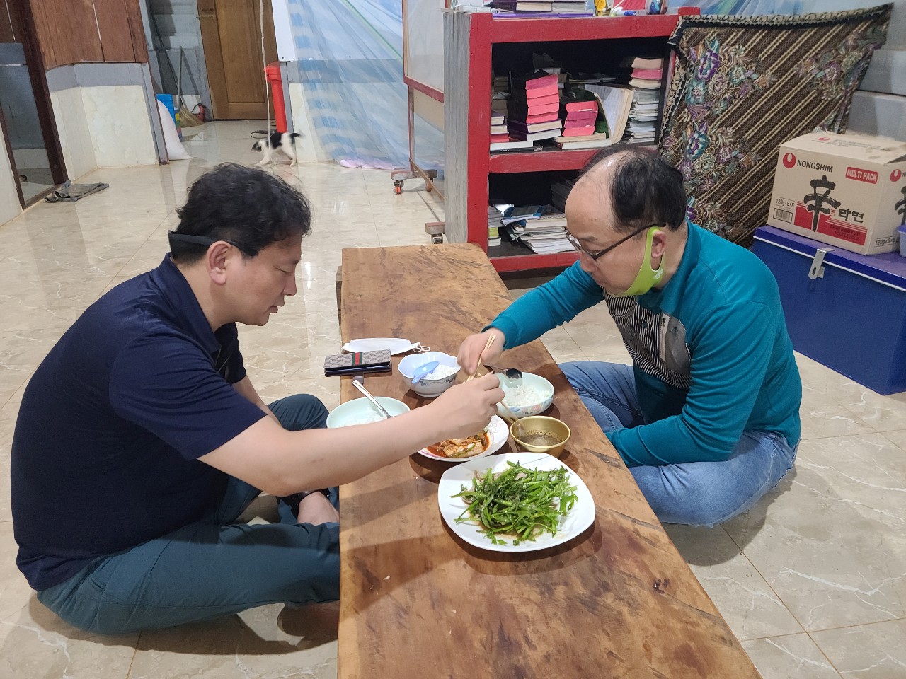 오늘 예배 시간에는 정만수목사님 특송. 시우메이 전도자가 특송을 했읍니다. 정목사님도 캄.에 장기로 나오시길 기도하고있읍니다. 자녀가 세명에 (고.중.초) 생계를 위해 건축현장에서 일을 해오셨읍니다. 김희중집사님도 트모방 직업학교 설립을 위해 장기 선교사로 준비중입니다. 오후에는 김재호목사님과 소넴사역자. 신학생. 정만수목사님. 시우메이 전도인과 같이 죰노암마을의 죰라은 신학생 집에가 예배를 드렸읍니다. 이곳에도 교회가 서기를 기도중입니다. 주인이 땅을 내어놓았는데 주님의 인도를 기다립니다. 내일은 밥을 해주신 레악사 아줌마와 캄퐁솜에 몇일 갔다옵니다. 아줌마 막내 아들이 코로나에 걸려 좀 보고와야 겠다해서 다녀옵니다.