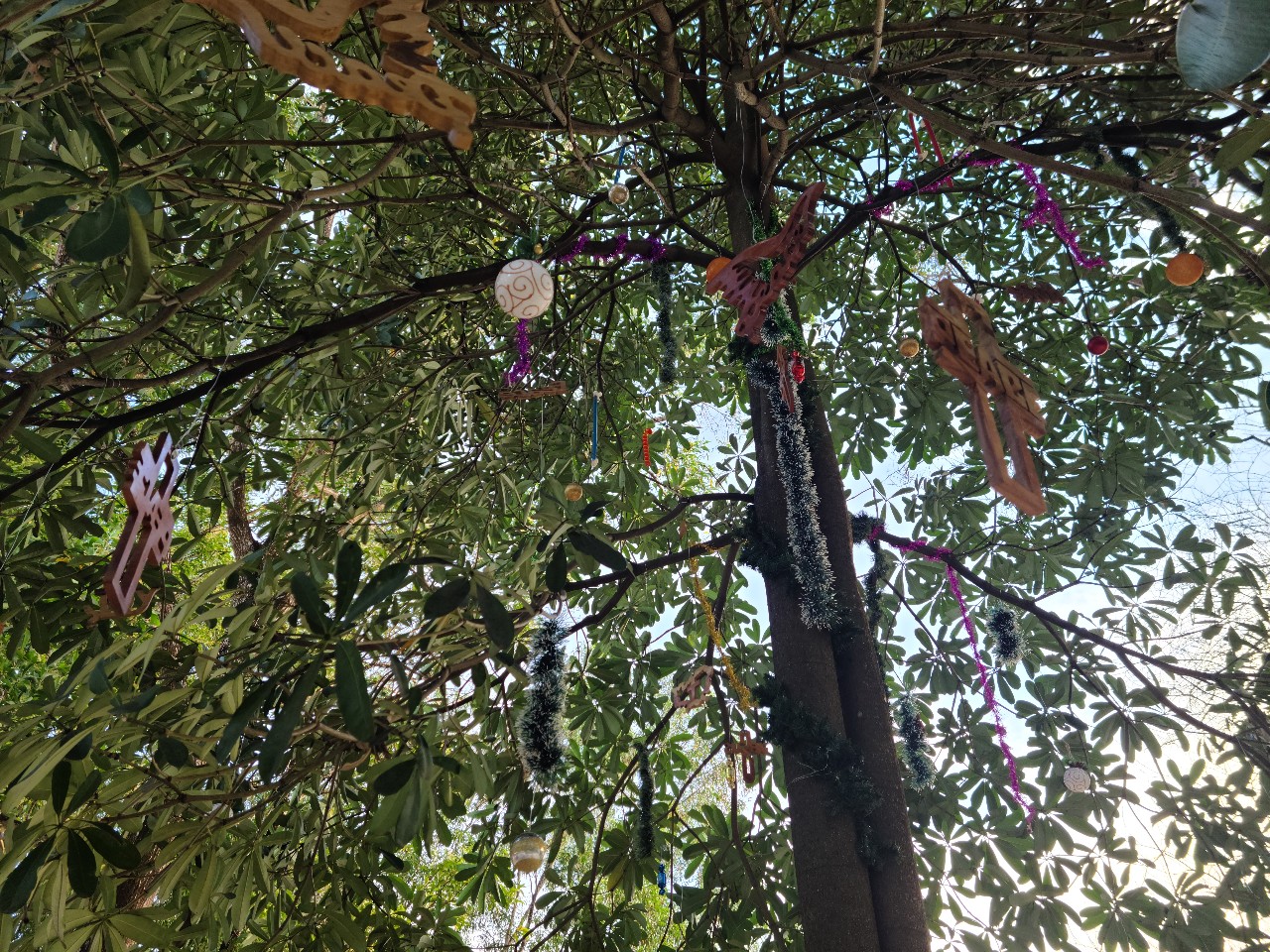 어제 오후 찬양연습을 못해 오늘 새벽 기도회 시간에 크리스마스 찬양을 연습하고 아침 8시부터 크리스마스트리 데코에 들어갔다. 이 나무는 왕개미가 많아 개미들이 잎사귀를 말아 개미집을 많이 만들어 놓은 나무라서 데코전에 먼저 스프레이 약을 뿌리고 시작했다. 사다리 2 개를 가져와 올라가 높은 나무 가지에 하나씩 매달았다. 단단한 나무로 조각한 Peace. Prayer. Love 같은 글짜로 된것과 문방구에서 사온 장식품을 같이 철사로 매달았다. 몇년은 갈것같다. 많이 메달았는데도 나무 밖에서는 잘 안보이지만 바로 밑에서 보면 근사하다. 지선교사님이 면장갑을 사와 학생들 모두 장갑을 끼고 오려 놓은 모양에 페이트 칠을했다. 이제 큰 나무 하나는 데코가 끝났고 본당을 시작한다. 나무집과 큰 나무를 연결하는 장식을 긴 막대기에 하나씩 늘어뜨려 각자의 작품을 매달고 막대기 끝에 철사로 연결해 늘어뜨렸다. 폐품을 이용해 다같이 작품을 만들고 나니 멋있다. 지선교사님 부부가 음료와 치킨을 사와 다같이 먹었다. 오늘은 크리스마스 이브. 이렇게나마 우리의 예물을 준비했다. 메리 크리스마스..
