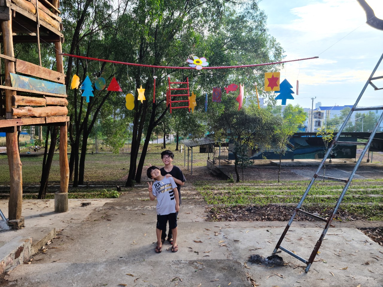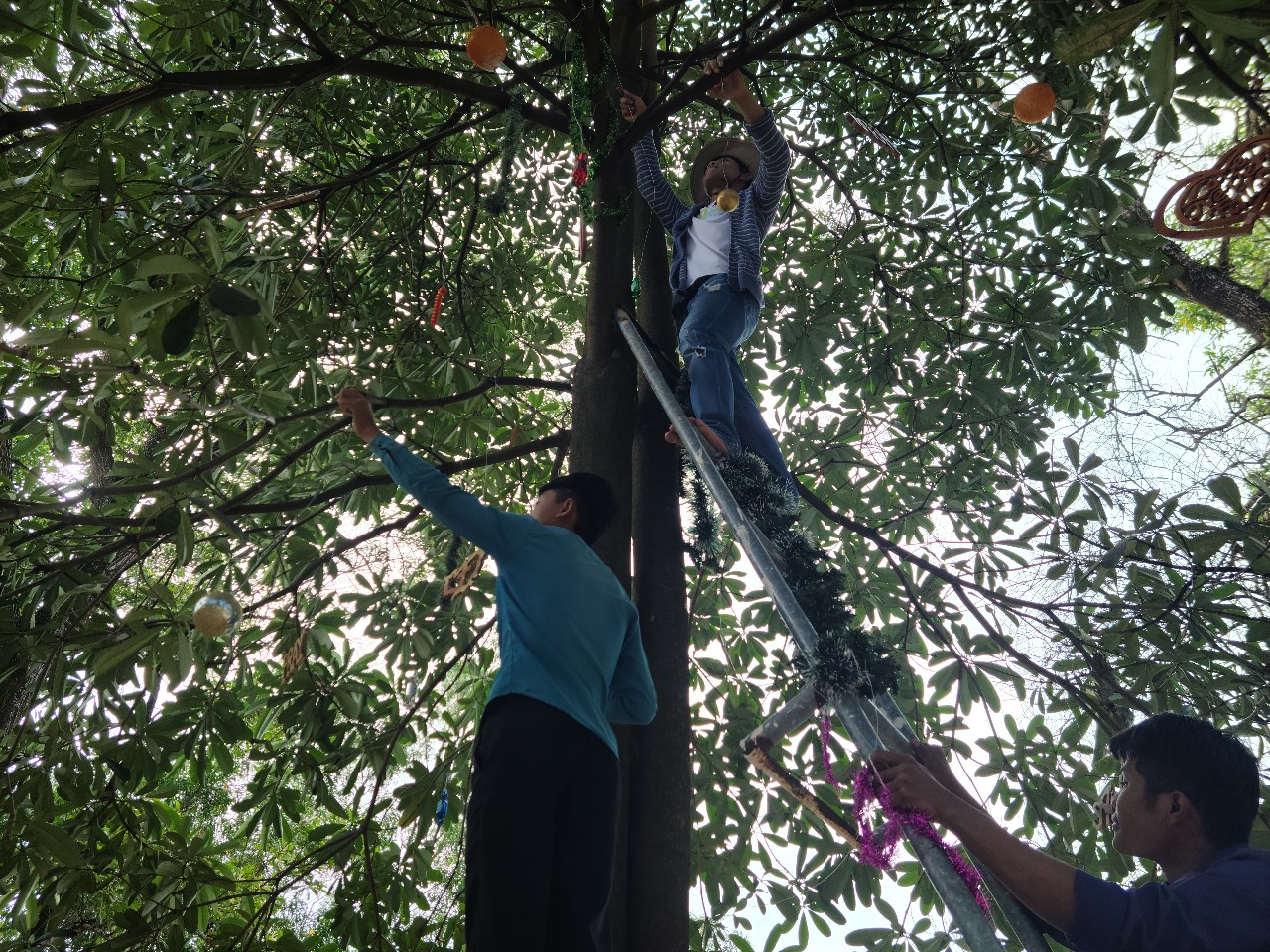 어제 오후 찬양연습을 못해 오늘 새벽 기도회 시간에 크리스마스 찬양을 연습하고 아침 8시부터 크리스마스트리 데코에 들어갔다. 이 나무는 왕개미가 많아 개미들이 잎사귀를 말아 개미집을 많이 만들어 놓은 나무라서 데코전에 먼저 스프레이 약을 뿌리고 시작했다. 사다리 2 개를 가져와 올라가 높은 나무 가지에 하나씩 매달았다. 단단한 나무로 조각한 Peace. Prayer. Love 같은 글짜로 된것과 문방구에서 사온 장식품을 같이 철사로 매달았다. 몇년은 갈것같다. 많이 메달았는데도 나무 밖에서는 잘 안보이지만 바로 밑에서 보면 근사하다. 지선교사님이 면장갑을 사와 학생들 모두 장갑을 끼고 오려 놓은 모양에 페이트 칠을했다. 이제 큰 나무 하나는 데코가 끝났고 본당을 시작한다. 나무집과 큰 나무를 연결하는 장식을 긴 막대기에 하나씩 늘어뜨려 각자의 작품을 매달고 막대기 끝에 철사로 연결해 늘어뜨렸다. 폐품을 이용해 다같이 작품을 만들고 나니 멋있다. 지선교사님 부부가 음료와 치킨을 사와 다같이 먹었다. 오늘은 크리스마스 이브. 이렇게나마 우리의 예물을 준비했다. 메리 크리스마스..