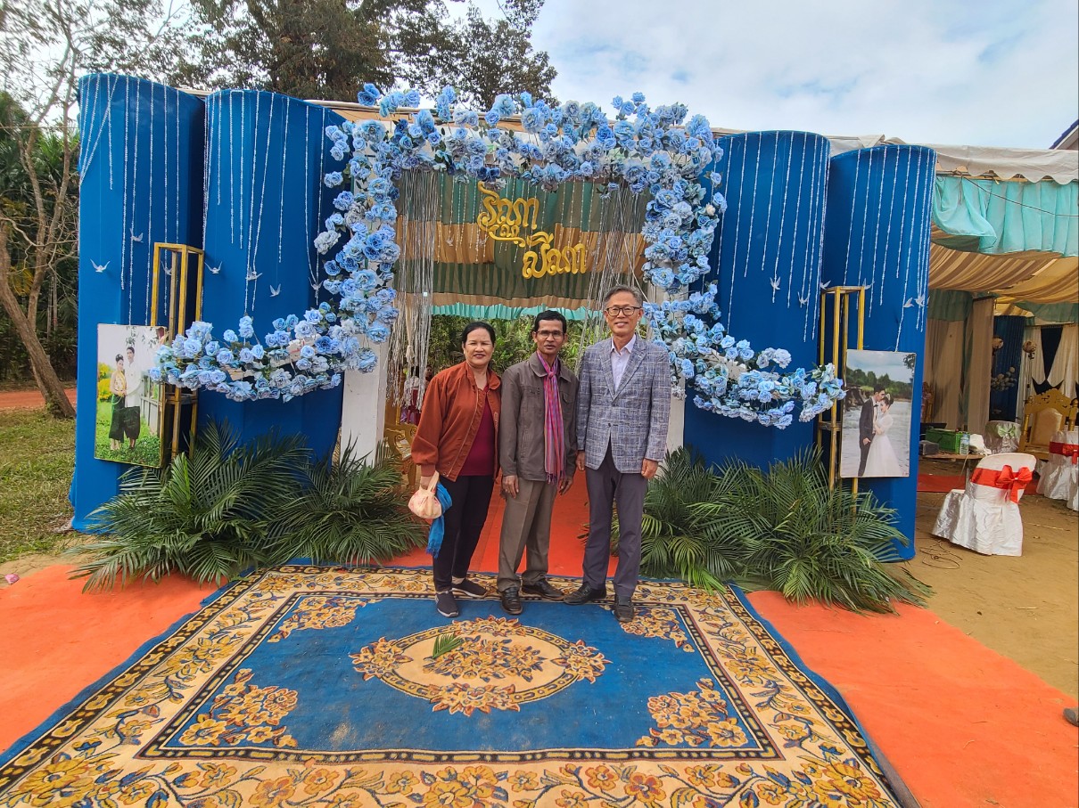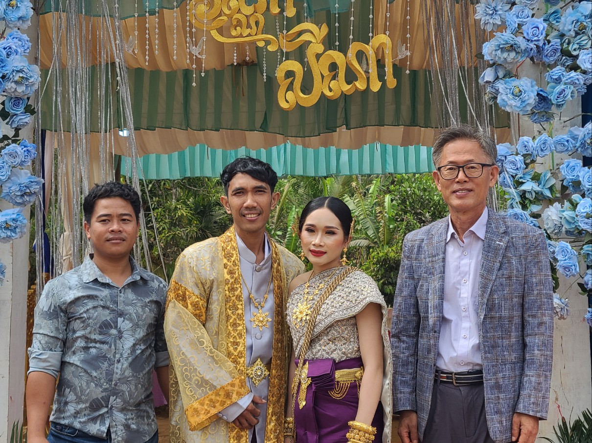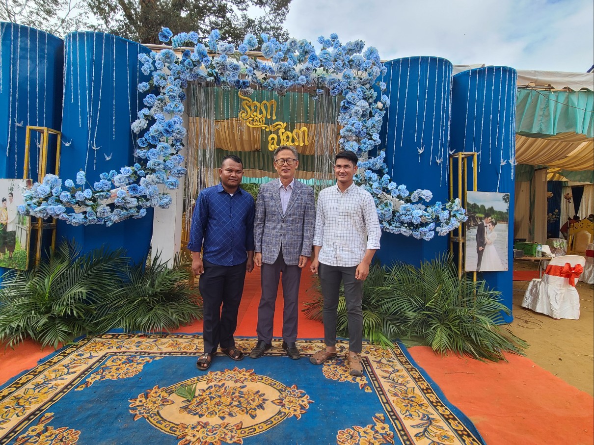 새벽 기도 시간에 시편 121편 나의 도움이 어디서 올꼬, 천지를 지으신 여호와에게서 오리라. 말씀을 가지고 현실 생활의 어려움을 이겨 나가자고 권면했다. 소넴사역자가 그간 어려운 가운게 굳건히서서 오늘까지 왔는데 생활고 때문인지 최근 Wing을 한다고 그 속에 온종일 앉아 있다고 하니 참 답답하다. 소넴 모토를 타고 30분정도 산길을 달려 쫌까째익 결혼식에 참석했다. 전통식을 위주로한 예식이다. 신랑.신부.그리고 양가집 부모들이 같이 앉아 과일를 한가득 같다놓고 전통음악에 전통무를 추며 계속 대담식의 이야기를 주고 받으며, 또 과일을 하나씩 꺼내 보이기도하고, 양가 부모가 같이 바나나를 먹기도하고, 촟불 의식, 등등 많은 절차가 있다. 나는 말씀을 전했고 캄퐁톰에서 온 소쿤목사가 전통의례를 주도했다. KBS 출신인 여러 친구들이 참석했다. 이들은 신랑 심반나와 같은 때에 KBS에서 공부한 친구들이다. 신부인 리나 자매는 솜판 사역자 여동생이고 일곱 형제 자매중 여섯번째이다. 꼬꽁에서 여러 사역자가 참석했고 스라에엄벌의 속모노목사 부부도 왔다. 햇볕이 별로 없어 예식내내 덥지 않았고 식사때는 KBS출신 테이블에서 같이 먹으며 근황을 물어 보았다.어제 차 한대로 출발해서 스라에엄벌 스언사역자 집에서 하룻밤 자고 오늘 이리로 왔다고했다. 완니. 소넴.솜판. 쏘비엣. 속옝. 마린은 결혼했고 테드. 뽀아임은 아직 미혼이다. 식사하면서 트모방 Christian Community 에 대해 설명했다. 뜻이 있으면 같이 동참하라고 했다. 2012년 똔나사역자가 KBS를 졸업하고 쏘키어 여학생과 결혼해서 바로 이곳 트모방 쬼까째익 마을에서 한쪽벽도 없이 트인 방하나 달랑 있는 덜 지어진 공간에서 부엌도 화장실도 없이 사역을 시작했는데 이제 솜판 사역자, 끔산 사역자에 이어 리나자매도 사역자 사모가 되어 사역의 열매가 맺혀져간다. 신혼부부가 선물로 준 과일바구니를 받아 소넴 모토로 다시 그 산길을 따라 트모방 비젼교회로 돌아왔다.
