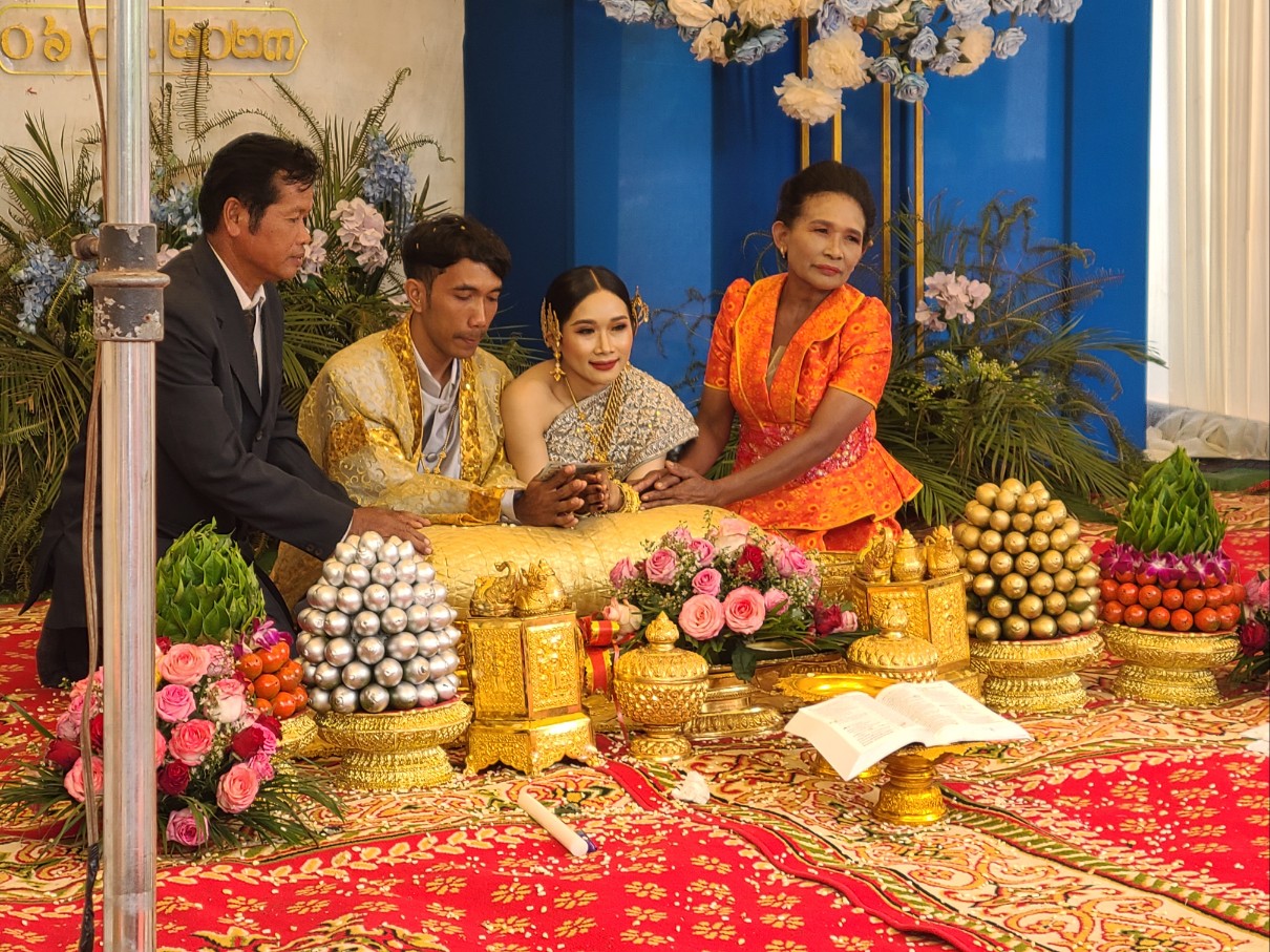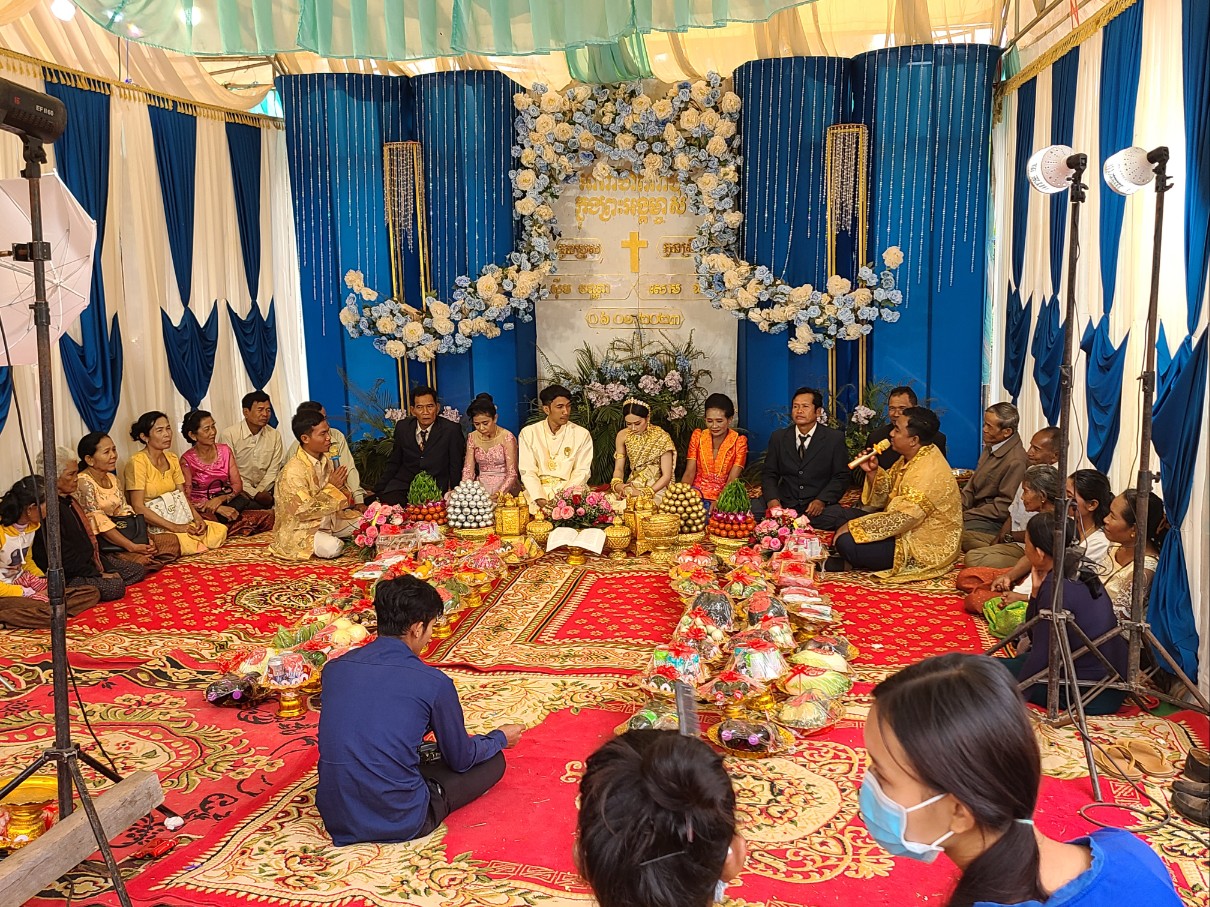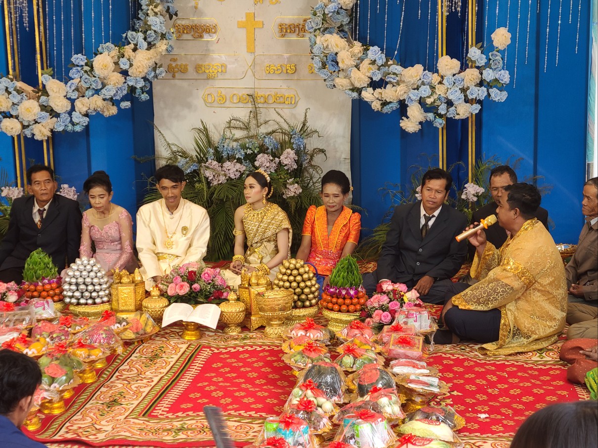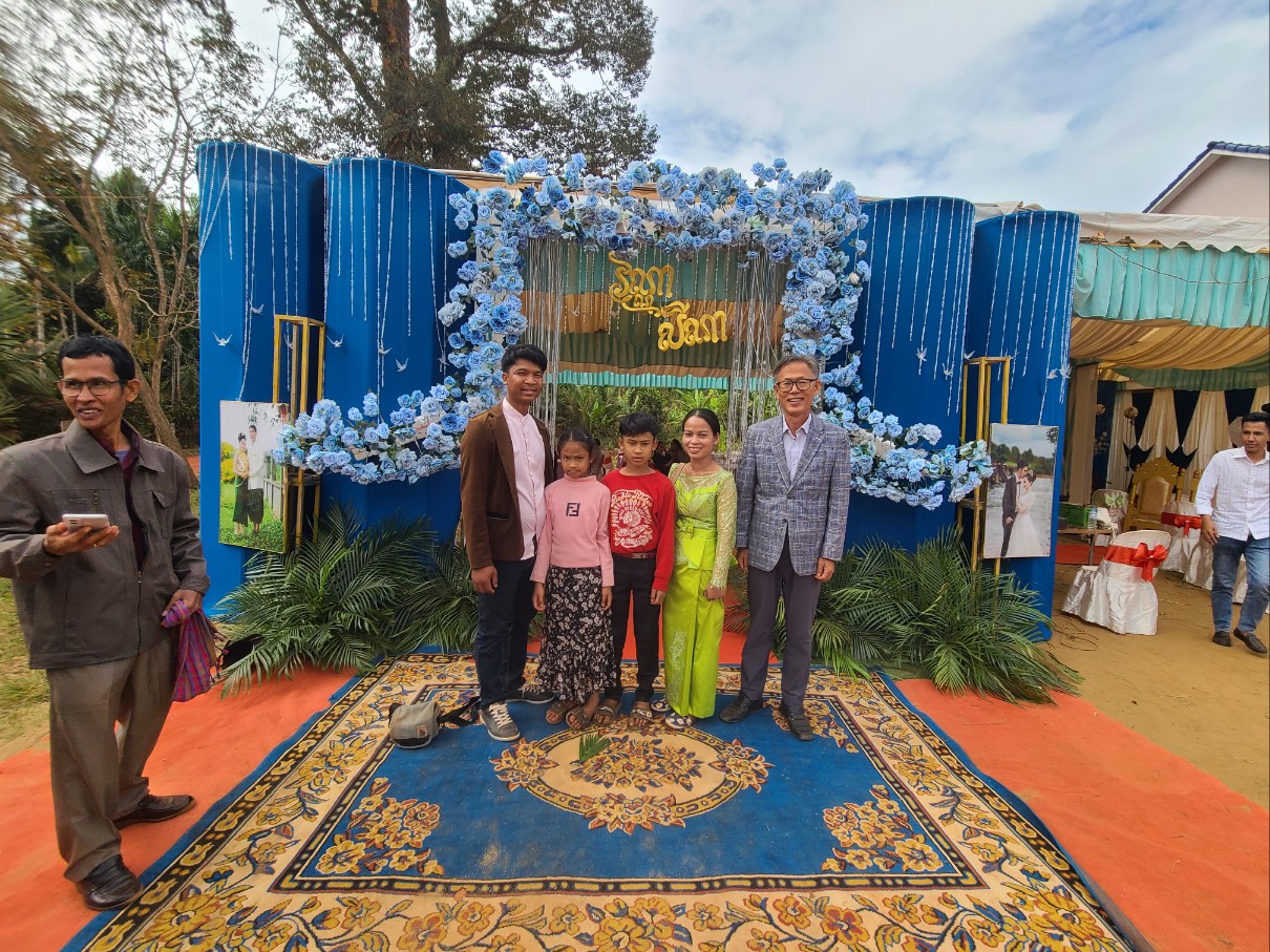새벽 기도 시간에 시편 121편 나의 도움이 어디서 올꼬, 천지를 지으신 여호와에게서 오리라. 말씀을 가지고 현실 생활의 어려움을 이겨 나가자고 권면했다. 소넴사역자가 그간 어려운 가운게 굳건히서서 오늘까지 왔는데 생활고 때문인지 최근 Wing을 한다고 그 속에 온종일 앉아 있다고 하니 참 답답하다. 소넴 모토를 타고 30분정도 산길을 달려 쫌까째익 결혼식에 참석했다. 전통식을 위주로한 예식이다. 신랑.신부.그리고 양가집 부모들이 같이 앉아 과일를 한가득 같다놓고 전통음악에 전통무를 추며 계속 대담식의 이야기를 주고 받으며, 또 과일을 하나씩 꺼내 보이기도하고, 양가 부모가 같이 바나나를 먹기도하고, 촟불 의식, 등등 많은 절차가 있다. 나는 말씀을 전했고 캄퐁톰에서 온 소쿤목사가 전통의례를 주도했다. KBS 출신인 여러 친구들이 참석했다. 이들은 신랑 심반나와 같은 때에 KBS에서 공부한 친구들이다. 신부인 리나 자매는 솜판 사역자 여동생이고 일곱 형제 자매중 여섯번째이다. 꼬꽁에서 여러 사역자가 참석했고 스라에엄벌의 속모노목사 부부도 왔다. 햇볕이 별로 없어 예식내내 덥지 않았고 식사때는 KBS출신 테이블에서 같이 먹으며 근황을 물어 보았다.어제 차 한대로 출발해서 스라에엄벌 스언사역자 집에서 하룻밤 자고 오늘 이리로 왔다고했다. 완니. 소넴.솜판. 쏘비엣. 속옝. 마린은 결혼했고 테드. 뽀아임은 아직 미혼이다. 식사하면서 트모방 Christian Community 에 대해 설명했다. 뜻이 있으면 같이 동참하라고 했다. 2012년 똔나사역자가 KBS를 졸업하고 쏘키어 여학생과 결혼해서 바로 이곳 트모방 쬼까째익 마을에서 한쪽벽도 없이 트인 방하나 달랑 있는 덜 지어진 공간에서 부엌도 화장실도 없이 사역을 시작했는데 이제 솜판 사역자, 끔산 사역자에 이어 리나자매도 사역자 사모가 되어 사역의 열매가 맺혀져간다. 신혼부부가 선물로 준 과일바구니를 받아 소넴 모토로 다시 그 산길을 따라 트모방 비젼교회로 돌아왔다.