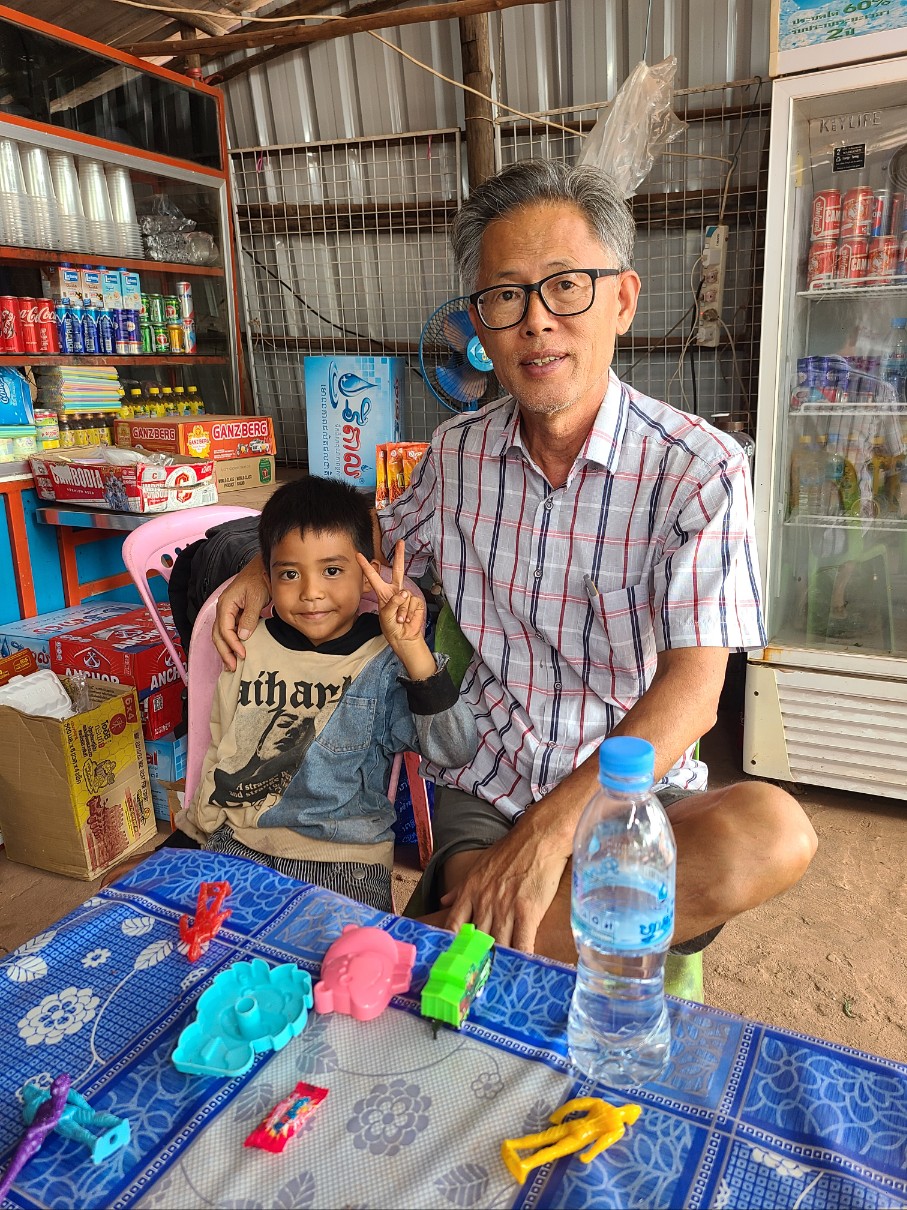 2023년 1월 6일 쬼까째익에서 결혼식이 있어 그 오지에 가기위해 하루 일찍 출발 하기로 하고 예식에 입을 옷가지를 베낭에 넣고 그곳 1월 날씨가 싸늘하므로 내복도 넣고 쉐타도 넣고 다니엘에게 꼬꽁가는 차를 알아봐 달라고했다. 5일날 아침 8시경 차가 출발한다고 했다. 다니엘이 모는 모토를 타고 택시정류 장에 가서 합승 택시를 타고 트모방 진입로인 비얼삐에와서 거기서 트모방 들어가는 차를 기다리려 가게안에 들어갔다. 도로공사 때문에 연신 큰 트럭들이 오간다. 온 먼지가 가게 안으로 들어온다. 전에 만나서 좀 놀았다고 안면이 있어 남자아이가 미소를 짓는다. 탁자에 앉아 그가 혼자 노는 것을 보았다. 장남감을 가지고 같이 놀아주니 장남감을 하나씩 다 꺼내온다. 한 시간 이상 그렇게 놀았는데도 들어가는 차가없다. 먼지는 계속 들어오고 양철지붕밑이라 덥다. 이런 곳에서 하루종일 장사 해야하고 이 어린아이는 엄마와 같이 이곳에 있어야한다. 나중엔 친해져서 가게에 팔려고 걸어놓은 소세지도 가져와 하나주고 사탕도 주고 땅콩도 준다. 이름이 란이고 6살 이라했다. 무거운 생수 박스를 가져오더니 하나씩 냉장고에 넣고 박카스 박스도 뜯어 냉장고에 넣는다. 시키지도 않았는데 냉장고 안이 빈것을 보고 6살짜리가 채워놓는 것을보고 놀랐다. 하루 종일 혼자서 그 좁은 공간에서 먼지 마시며 놀고, 흙놀이 하고 통나무 가지고 놀고, 풀 뜯어다가 놓고, 장남감 꺼내 놀다, 통에 넣어 원위치 시키고, 밥먹고 엄마일도 돕고 그렇게 하루를 보내는것같다.