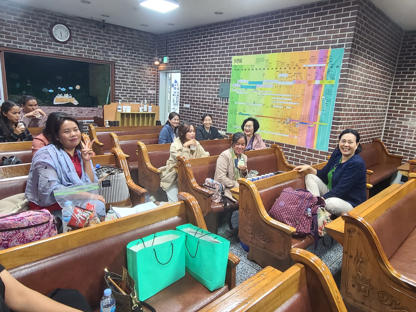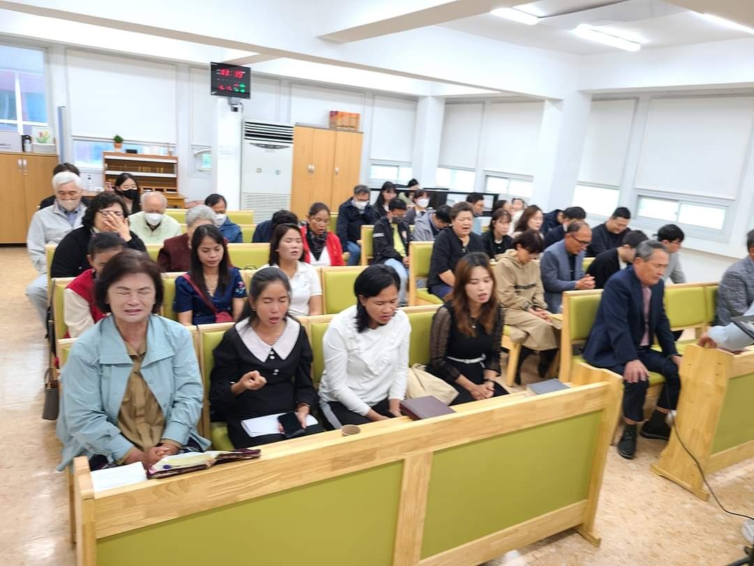 차 두대로 우중에 서대구교회로 가니 김진홍목사님과 많은 교인들이 예배당에서 우리를 기다리고 있었다. 토요일이라 젊은 성도님들이 많았다. 같이 찬송하고 팀 소개를하고 서대구교회가 15년 가까이 후원하는 끄렉교회의 스라이니엉 사모의 간증이  있었는데 조그만 임대 공간에서부터 시작해서 교회부지를 그리고 건축까지 하게된 내역을 이야기하고 스라이뻐우 자매도 오뜨레 마을 도로가 텐트생활에서 프놈펜 왕립대 경제과를 졸업하고 십수년간 교도소 사역을 해온 간증을 하며 하나님의 신실함을 나누었다. 서대구교회 역사를 오래된 사진을 통해 보고  예배.선교등의 교인사명문을 들었다. 같이 점심식사를 식당에 가서하고 차량 두대로 경북대학으로 갔다.