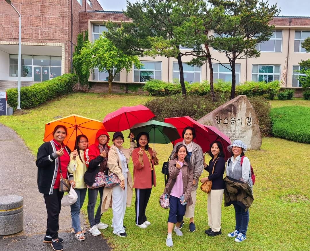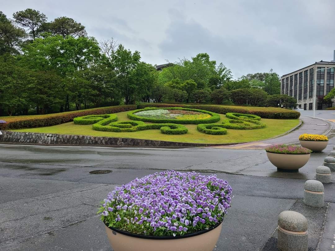 안에 들어와 옛모습을 알아보지 못하게 변해서 한참을 헤메다가 시계탑으로 가니 박종환 장로님이 기다리고 있었다. 이분은 이곳에서 30여년간 근무하고 연구하다가 퇴임했다. 일단 본관을 보고 김은실 선교사가 공부한 사범대학으로 가서 "참 스승의 길" 이라고 새겨진 돌에서 사진을 찍으며 스승과 제자,  선교사와 선교지의 제자의 관계가 어떠해야 할지를 생각해봤다. 비는 계속 부슬부슬 내리고 명지교회에서 선물 받은 여러 색갈의 우산들이 교정을 밝은 모양으로 바꾸었다. 다시 경상대 쪽으로 발길을 옮기니 그 건물은 예나 지금이나 그대로였다. 77년 입학했으니 46년이 됐다. 가끔 테니스 라켓을 가져와 벽치기 하던 그 건물벽, 김선교사도 가끔 이곳에 와서 수업을했다. 쏙쩬다 사모가 자꾸 우리가 어디서 만났는지 이야기 해달라고한다. 다방에 남.여학생 여러명가서 사다리타기 해서 만났다는 이야기를 할려면 시간이 필요할것 같아 나중에 해주겠다고하니 조금있다. 또 묻고 또묻는다. 나중에, 나중에 하며 교정을 걸어갔다. 바가오고 쌀쌀해서 찻집에 들어가 이야기 하다보니 고속버스 시간이 촉박해 터미날로 가니 타는곳을 잘 알수도없고 차를 먼곳에 대다보니 그 많은 짐들과 큰 박스를 옮기는 것이 문제였다. 일단 내가 짐을 몇개 끌고 광장을 누비며 버스터미널을 물어 건물로 들어가니 바로 첫번째 문에 광주 라고 쓰여있어 팀들을 하나씩 불러모았다. 거의 차를 놓쳤다고 생각하니 이 인원이 어디서 자고 다음 일정이 망가지는데.. 하는 아찔한 생각에 한동안 식은 땀이 났다. 또한번 짐과의 전쟁을 치뤘다. 대구에 있는동안에는 계속 비가왔다.