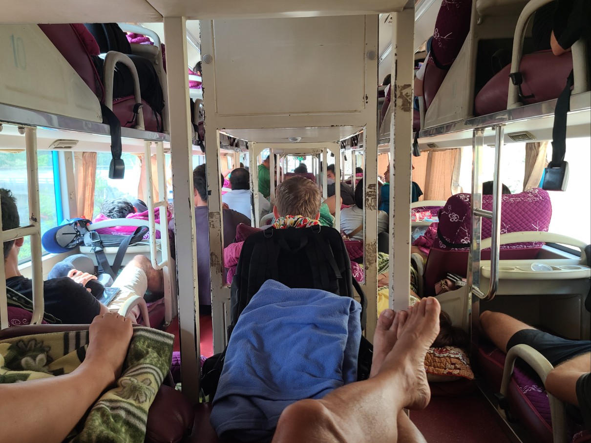 점심때 길을건너 치킨집에 들어가니 한국사람이 주인이었다. 나는 치킨을 주문해주고 건너편 쌀국수를 먹을까 했는데 그냥 먹어보기로했다. 간장 치킨, 후라이드 치킨, 등을 시켜먹었다. 보통 치킨을 거의 안먹고 먹어도 한.두 조각인데, 젊은이들과 같이 먹어서인지 대여섯 조각을 먹었다. 홍미자매는 감기 기운이있어 포장해서 갇다주었다. 오늘은 장거리 가는 날이라 긴장이된다. 오후 6시경에 남부터미날에 도착해 semi-sleeping bus 를 탔다. 길이대로 세줄로 2층 침대가 배치되었으며 그 사이로 2개의 좁은 복도가있었고 복도에도 사람들로 꽉 차게 누웠다. 그러니까 길이대로 5 줄로 사람이 누운것이다. 아래층에는 5줄 2층은 세줄, 화장실 한번 가는데도 누워있는 사람을 밟지 않고 잘 건너가야한다. 이렇게 24시간을 가야할것을 생각하니 아찔하다. 2019년 일산병원에 입원해 각종 줄을 달고 꼼짝 못하고 침대에 누워 오랜 날들을 보내던 것이 생각난다. 홍미자매가 가장 힘든곳에 자리했다. 자정쯤되자 식당에 차가 서서 잠시 바람을 쐬고 화장실 갈것을 생각하니 물도 마실수없었다. 멍한 가운데 내렸다가 멍한 상태로 다시 탔다. 40여명을 태운 버스는 좁고 꼬불 꼬불한 도로를 올라가고있다.