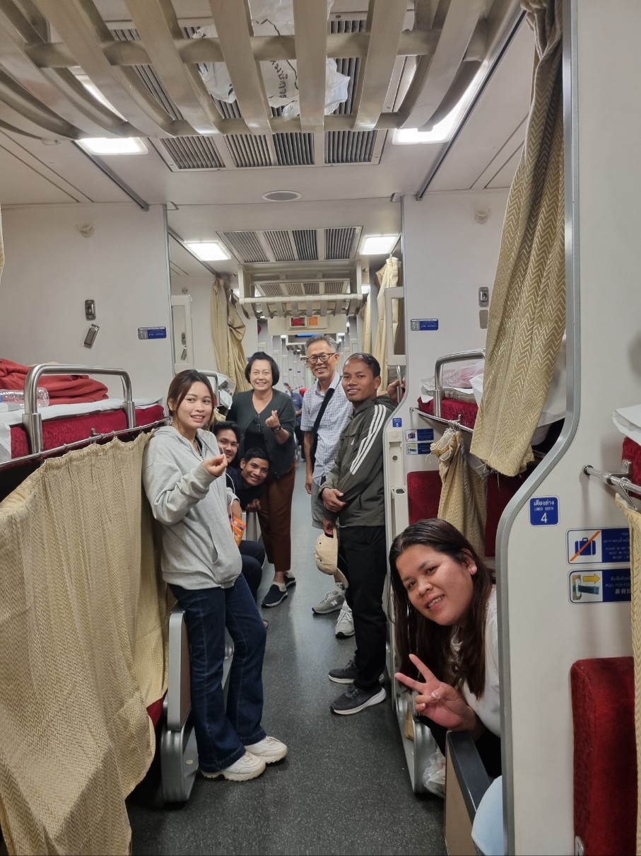 내려가서 꾸이띠우를 먹고 이종보, 최용삼 선교사님이 차를 가져오셔서 꼬꽁국경까지 가서 출국 수속하고 다시 태국 입국수속하고 밴 두대로 9시50분 출발해서 Trat을 거쳐 방콕까지 430키로정도 오후 4시반경 방쓰 기차역에 도착했다. 열차는 아래층 위층으로 펼쳐져 잠을 잘수있게 되어있다. 13시간후에 창마이 도착이다. 장거리를 편하게 가게됐다. 잠자리를 만들어 아래층, 윗층에 모두 누우니 좁은 공간에 다세대가 사는 효용성높은 주택같다. 열차는 계속 밤속으로 달리고 앉아서 이야기하던 좌석은 침실이되고, 커튼이 쳐지고 모두들 조용해졌다. 승무원이 가끔 체크하러 다니고, 이렇게 여행하면 시간절약, 경비절약, 알뜰한 여행을 할수있다.