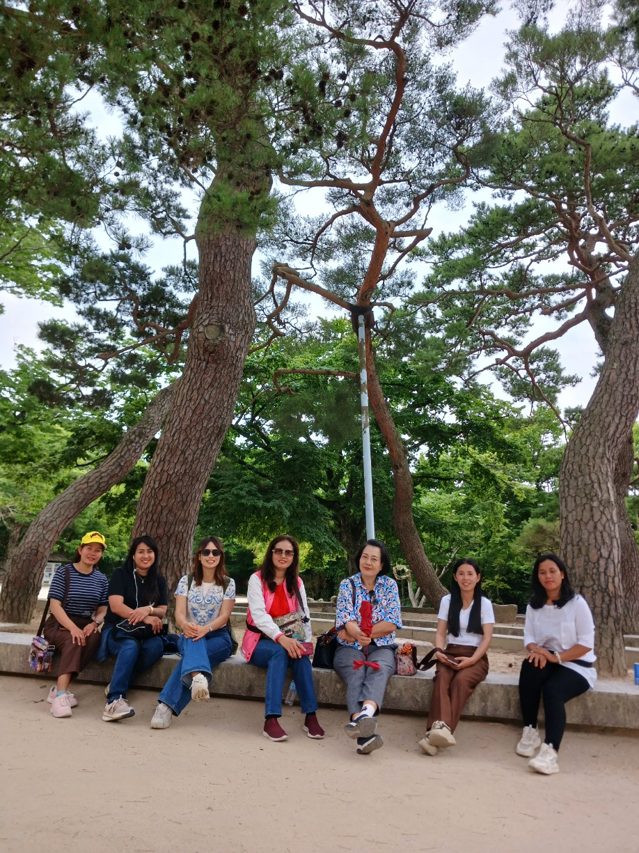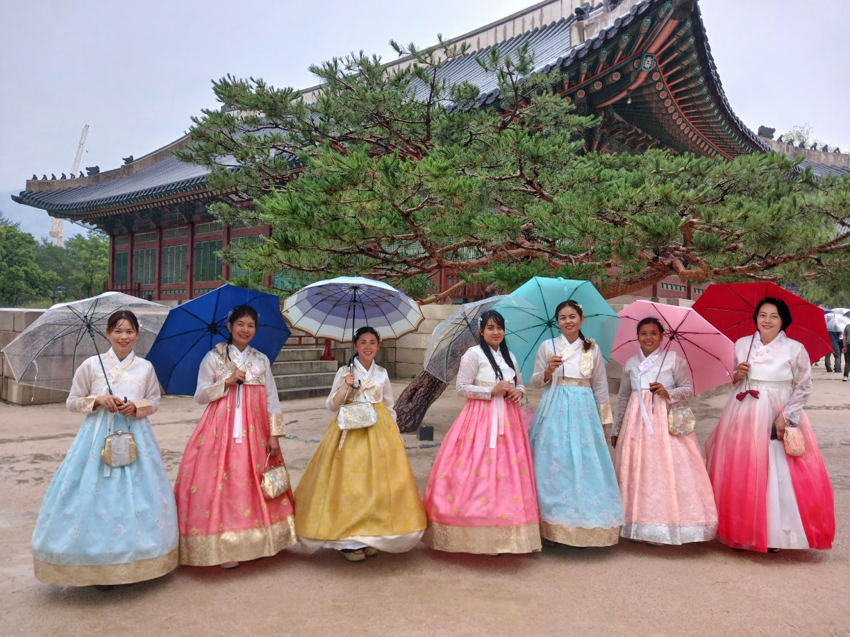 경복궁에 가서 한복입고 비가 부슬부슬 내려 우산을 쓰고 사진을 찍었다. 날씨가 시원해서 좋다. 여러 색갈의 고운 한복, 다양한 색갈의 우산을 쓰고 녹음이 짙은 궁궐터에,  단아하면서 위풍당당한 고옥들, 그속에서 캄보디아 냐꾸루 (여선생)들이 물만난 고기마냥, 온통 궁궐안을 신나게 떠들썩하게 무리지어 다녔다.