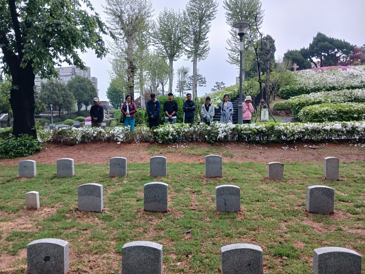 해변가에 있는 그의 무덤에 가서 다같이 손을 얹고 기도하고 화창하고 시원한 날씨속에서 그의 사역을 되새기며 다짐하고