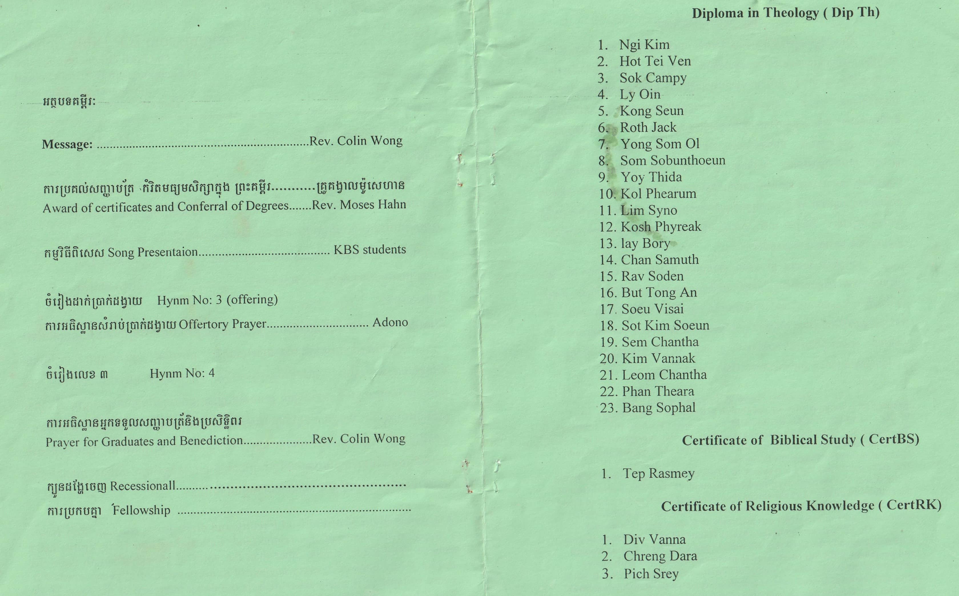 올해 4월에는 제5회 졸업식이 캄퐁솜 신학교에서 있었습니다. 23명의 학생이 Diploma of Theology (3년 과정)으로 졸업하고 3명이 Certificate (1~ 2년) 과정으로 졸업했습니다. 거의 모든 학생들이 사역지로 나갔고 2명은 곧 사역지로 나갈 것입니다.