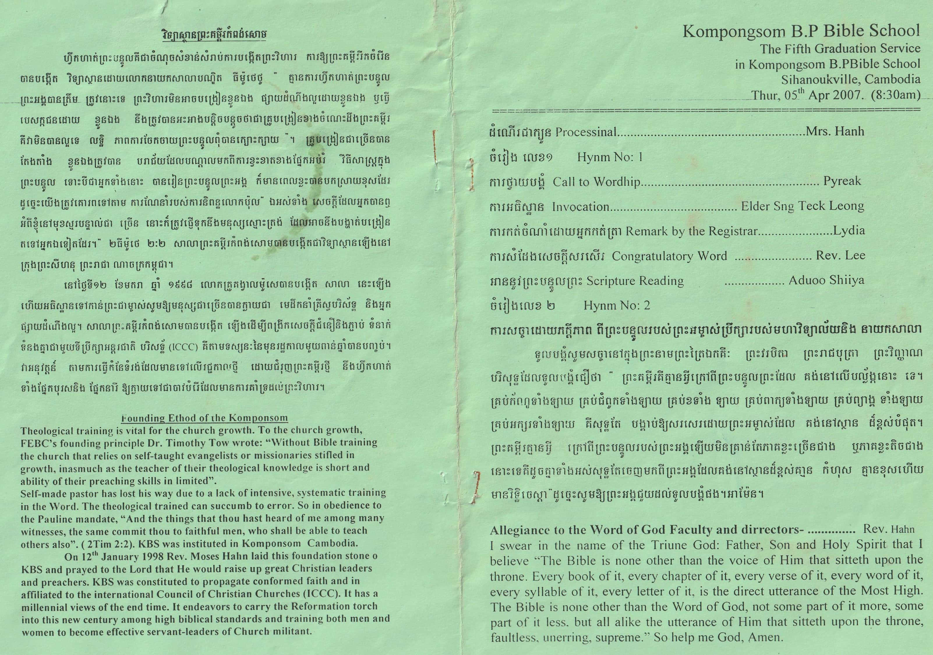 올해 4월에는 제5회 졸업식이 캄퐁솜 신학교에서 있었습니다. 23명의 학생이 Diploma of Theology (3년 과정)으로 졸업하고 3명이 Certificate (1~ 2년) 과정으로 졸업했습니다. 거의 모든 학생들이 사역지로 나갔고 2명은 곧 사역지로 나갈 것입니다.