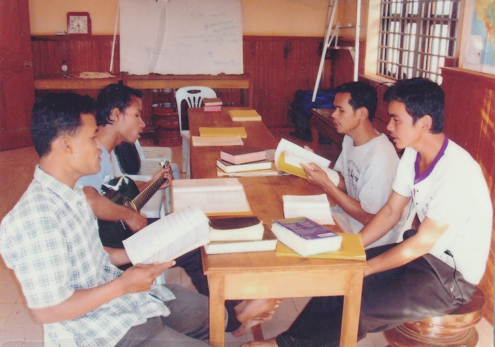 I read it with boy Soksan (10 years old) since 2006. He came to our mission house every morning with his mother. I enlarged Khmer Bible to A2 size, and read one page and Soksan one page. If my pronunciations were wrong, he corrected me. Every morning 6 AM we should read it together. It took more than one year to read whole bible. It was not easy. I wanted to skip the study of reading many times. He was patient, I also had to overcome the dizziness. It was so confused of the Khmer letters, so I felt the sense of dizziness when I tried to figure out the pronunciation. This small boy Soksan was my Khmer Bible reading teacher. After reading bible one time with him, I could read it two times more by myself.
